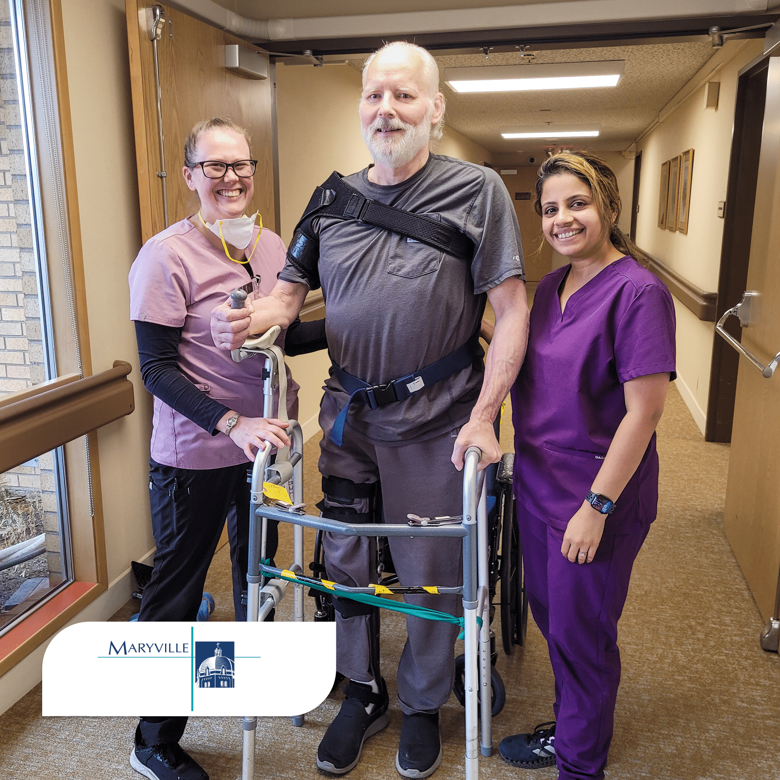 Mark arrived at Maryville after a stroke left him needing full support. He was bed-bound, relying on a Hoyer lift for transfers, and struggling with safe swallowing.